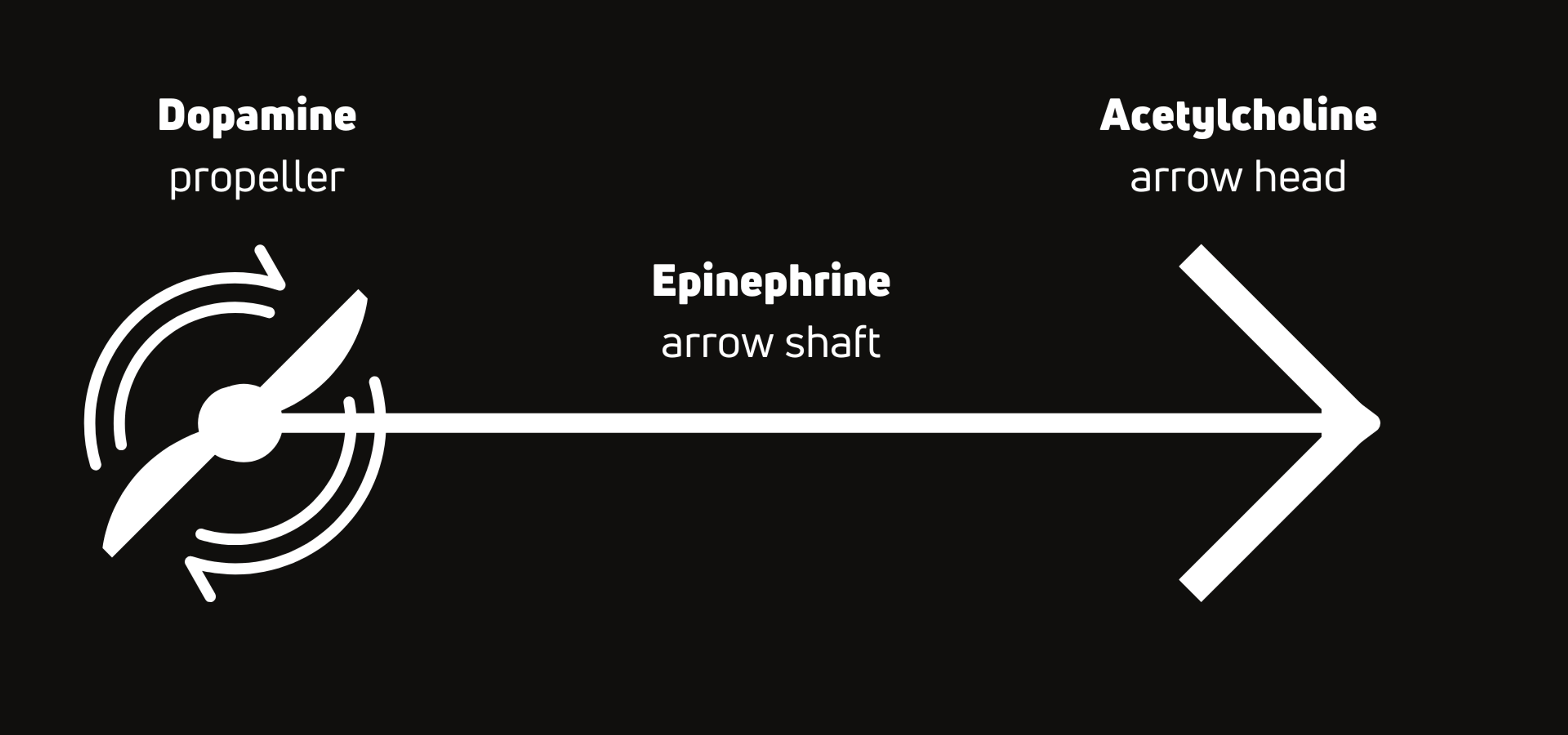 Dopamine gives the focus arrow motivation. It keeps it going. It is the endurance runner in the group.